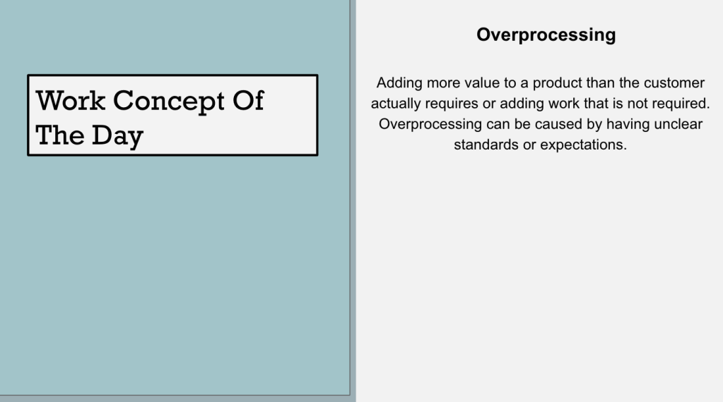 The work concept of the day can be lean related or business related. We teach everyone about markup %, profit and loss statements, gross and net revenue or profit, and other business or work terms. Employees get a small lesson in business terminology or other work related concepts; in the image above we cover one of the eight wastes.