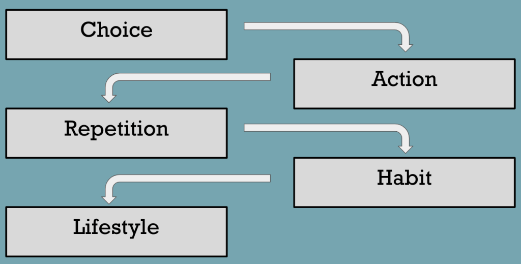 Every choice we make becomes an action we take. When choices and actions are repeated, they form habits. Our habits become our lifestyle. There is a reason repetition is touted by scientists and top performers for learning and improving; when actions are repeated it reduces the amount of brain power needed to repeat that action. This is why top athletes still practice fundamentals. This is why the military performs drills over and over again. Repetition has the power to produce an automatic reaction to given stimuli. The same is true in regards to happiness. All of the little choices we make every day have the power to influence our habits, our lifestyle, and our happiness.
